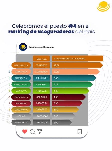 Basándose en datos de la Superintendencia de la Actividad Aseguradora (Sudeaseg), La Internacional de Seguros se afianzó como cuarta empresa líder del sector.